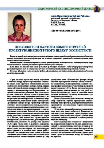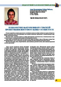 - Кабиш-Рибалка, Анна Валентинівна (2014) Рsychological factors of choosing the planning strategies of life line of personality Education and Development of Gifted personality, 2 (21). pp. 45-49. ISSN 2309-3935