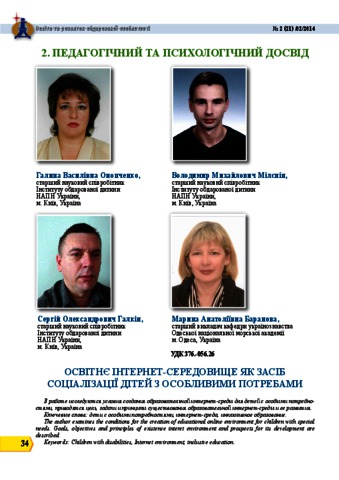 - Онопченко, Галина Василівна (orcid.org/0000-0002-9346-7405), Мілєнін, Володимир Михайлович, Галкін, Сергій Олександрович and Баранова, Марина Анатоліївна (2014) Educational internet environment as the method of children with special needs socialization Education and Development of Gifted personality, 2 (21). pp. 34-38. ISSN 2309-3935