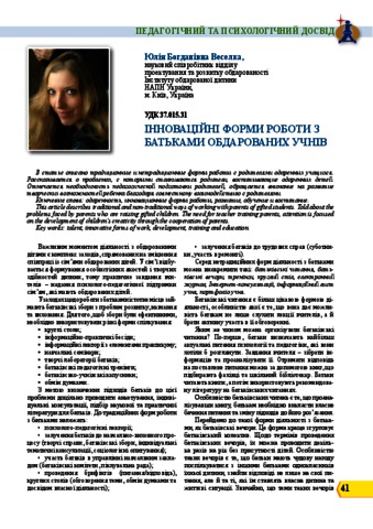 - Веселка, Юлія Богданівна (2014) Innovational forms of work with parents of gifted students Education and Development of Gifted personality, 4 (23). pp. 41-43. ISSN 2309‑3935