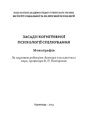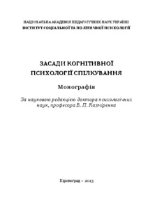 - Бєлоножко, Є. В., Гордієнко, В. І., Дідковський, С. В., Духневич, В. М. (orcid.org/0000-0003-0115-5517), Казміренко, В. П., Кудріна, Т. С., Сіверс, З.Ф. (orcid.org/0000-0002-2950-0741), Спіцина, Л. В., Осадько, О.Ю. (orcid.org/0000-0001-9644-421X) and Тоба, М. В. (2013) The principles cognitive psychology of communication Project Report. Імекс-ЛТД, м.Кіровоград, Україна.