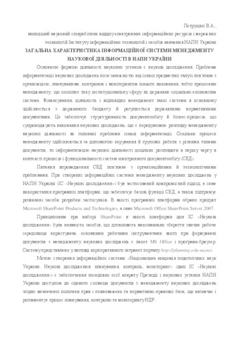 - Петрушко, В.А. (2013) General description of the information system of management of scientific activity is in NAPS of Ukraine In: Звітна наковова конференція Інституту інформаційних технологій і засобів навчання НАПН України . Інститут інформаційних технологій і засобів навчання НАПН України, м. Київ, Україна, pp. 93-95.