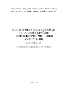 The monograph highlights the questions of intensification of political participation of youth, in particular structural and functional model of political participation, model of connection between the components and levels of social and political activity. Social and psychological factors that influence the level of preparedness of youth for political participation are considered. Authors’ methods of evaluation of motivation of political participation, degree of civic responsibility, manifestation of social and ideological stereotypes, factors that determine making decisions concerning political participation and political activity of young people are proposed. The monograph is addressed to the scientists and teachers in the field of political psychology, political science, sociologists, political and civil activists, and to all those who are interested or professionally engaged in civic education of youth and development of civil society in Ukraine.