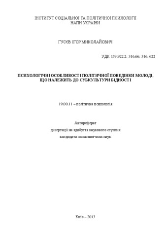 - Гусєв, Ігор Миколайович (orcid.org/0000-0002-3426-8799) (2013) Psychological Peculiarities of Behavior of the Youth Relating to the Subculture of Poverty Dissertation candidate2 thesis, Інститут соціальної та політичної психології.