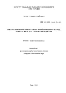 The thesis is dedicated to the study of psychological peculiarities of the political behavior of the youth relating to the subculture of poverty. Belonging to the subculture of poverty is grounded with subjective and objective criteria of poverty. Psychological peculiarities of the political behavior of the youth are: low motivation of the social and material needs in the policy, avoidance of political activity, depending on the social environment, political impulsive aggression. With the corrective influence it is proved the possibility to increase low motivation of the social and material needs in the policy and reducing political impulsive aggression.