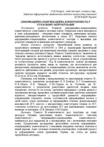 - Овчарук, О.В. (2014) Information and communication competence in contemporary statement In: Всеукраїнська науково-практична конференція з міжнародною участю "Управління інноваційним розвитком загальної середньої освіти в умовах соціально-економічних реформ" . ДВНЗ "Університет менеджменту освіти", м. Чернівці, Україна.