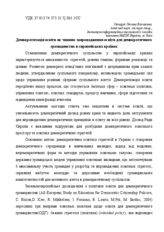 - Овчарук, О.В. (2014) Democratization of education as a factor of education for democratic citizenship implementation in european countries In: Педагогічна компаративістика – 2014: якісний вимір освіти зарубіжжя та український контекст: матеріали наук.-практ. семінару (Київ, 5 червня 2014) . Інститут педагогіки НАПН України, м. Київ, Україна.