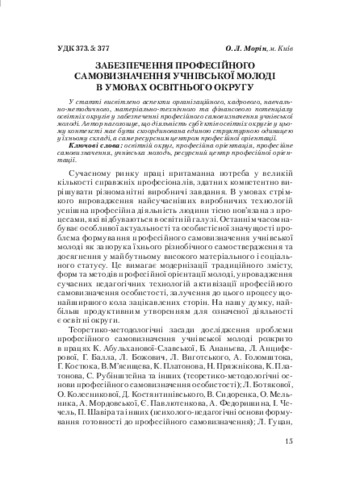 - Морін, О.Л. (orcid.org/0000-0001-5756-8359) (2014) Professional Self-Determination of Students in Educational Districts Теоретико-методичні проблеми виховання дітей та учнівської молоді, 1 (18). pp. 15-23. ISSN ISBN 978-966-189-298-8