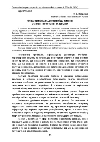- Петрочко, Ж.В. (2014) The conception of school friendly to a child: the essential ideas and key terms Педагогічні науки: теорія, історія, інноваційні технології, 2 (36). pp. 84-92. ISSN 2312-5993