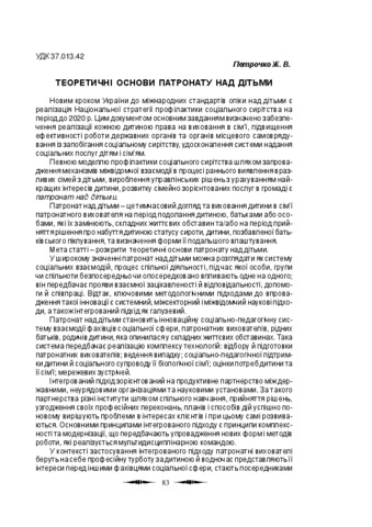 - Петрочко, Ж.В. (2014) Theoretical basis of patronage of children Соціальна педагогіка: теорія та практика: наук.-метод. журн, 1. pp. 83-90. ISSN 1817-3764