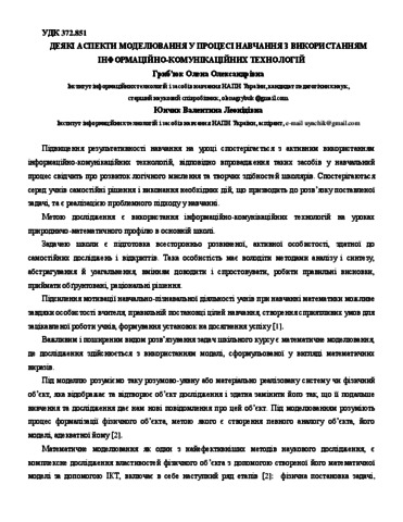 - Гриб'юк, О.О. and Юнчик, В.Л. (2015) Some aspects of modeling in learning using ICT In: "Topical issues of fundamental and applied studies". International internet conference for young researchers and students. . Вежа-Друк, м.Луцьк, Україна, pp. 21-24.