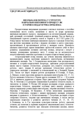 - Покусова, Олена Сергіївна (2014) School library in the structure of the educational process as a historical and pedagogical problem Психолого - педагогічні проблеми сільської школи (50). pp. 217-225.