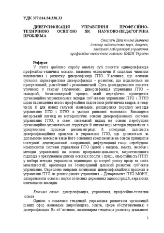The article attempts to analyze the essence of the concept of «diversification of vocational education», defined economic and social factors of development and diversification of VET. It was found that most essential characteristic of diversification - development. The essence of the concepts under study clarified in this interpretation: the diversification of VET management - a complex, multi - dimensional process that provides for organizational management activities PTO control subjects and vocational schools on improving the quality of professional training of the workforce, including new industries, expanding the list of management practices VET and vocational schools in a market economy. The author's view of the methodological basis for a diversified management of VET, namely: a systematic approach based on the restructuring of management and organizational structure and optimization of management methods with the deconcentration process and integration; the integrity of the diversification process in the management of VET, which is achieved by using the relationships of its main components, based on the principles of integration, decentralization, coordination, differentiation, and the like; restructuring of control system components VET (goals and tasks, content management tools) on the basis of program - targeted, marketing approaches, taking into account the market for educational services and labor; vocational schools independence in the selection of management practices in accordance with the needs of the labor market and its opportunities; focus on the holistic development of the continuous control subjects. Outlined the direction of diversification activation processes in the management of VET at different levels of government - the Department of VET Department of Education and Science of regional state administrations, heads of educational institutions.
