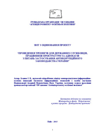 Evaluation of the project "Training for civil servants, prosecutors and lawyers on the application of anti-corruption legislation of Ukraine", implemented by NGO "Institute of Applied Humanitarian Research". Focus of evaluation: find out how well information was methodical and organizational support for a series of seminars in the project; to determine whether to continue the project and that this requires institutional support.