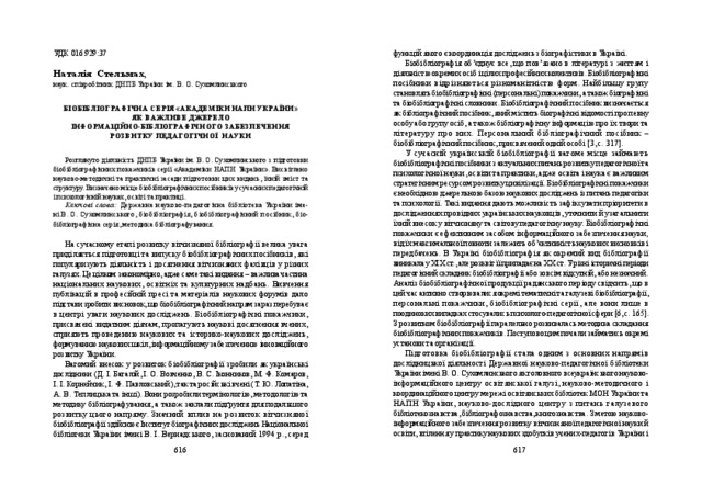 - Стельмах, Наталія Анатоліївна (2011) Biobibliographic Series «Academicians of NAPS of Ukraine» as an Important Source of the Information-bibliographic Supply for Pedagogical Science Development Наукові праці Національної бібліотеки України імені В. І. Вернадського (31). pp. 616-625. ISSN 2224–9516