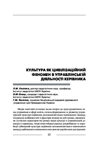 - Калініна, Л.М., Онаць, Олена Миколаївна and Калініна, Г. М. (2015) Culture as a civilized phenomenon in administrative activity of the head In: Modern progress of organizational culture of general educational establishment trends are in informative society, 10.04.2015, м.Київ, Україна.