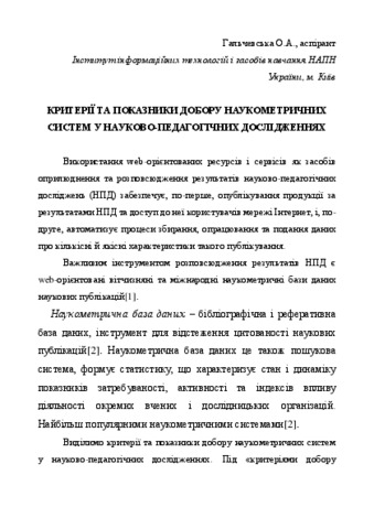 - Гальчевська, О.А. (2015) The criterias and their indicators of selection in scientometric systems in the scientific and pedagogical researches In: Автоматизація та комп’ютерно-інтегровані технології у виробництві та освіті: стан досягнення, перспективи розвитку: матеріали Всеукраїнської науково-практичної конференції . Черкаський національний університет імені Богдана Хмельницького,, м.Черкаси, Україна.