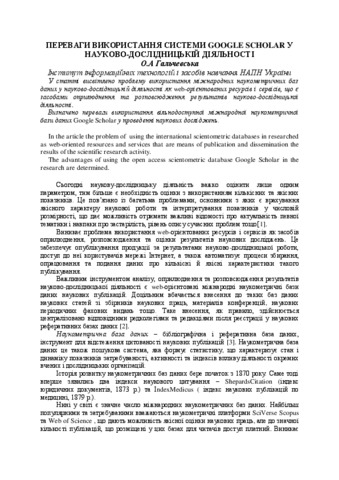- Гальчевська, О.А. (2015) The advantages of using the open access scientometric database Google Scholar in the research Сборник научных трудов II Международной заочной (с онлайн-участием) научно-методической конференции «Медиасфера и медиаобразование: специфика взаимодействия в современном социокультурном пространстве». pp. 91-95.