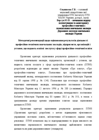 - Єльникова, Галина Василівна (2014) Guidelines for evaluating the performance of VET institutions, enterprises, organizations and institutions that provide educational services in vocational education На допомогу керівникові професійно-технічного навчального закладу, 1 (5). pp. 1-6.