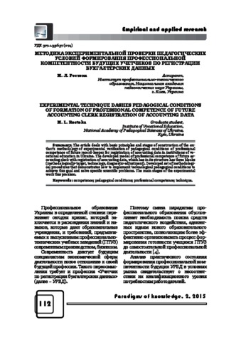 - Ростока, Марина Львівна (2015) Experimental technique dashes pedagogical conditions of formation of professional competence of future accounting clerk registration of accounting data Журнал «Paradigmata poznání» (Парадигмы познания), 2. pp. 112-117. ISSN 2336-2642