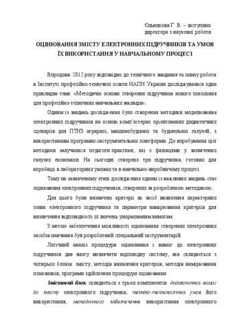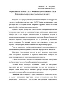 On the basis of logical analysis evaluation procedures and requirements for electronic books determined on a system that consists of four parts: content; methods of detection criteria; methods of measurement; application of the procedure for the assessment. Conditions of use of electronic textbooks in the educational process.