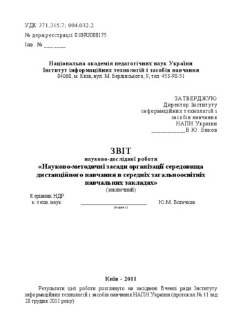 - Богачков, Ю.М. and Пінчук, О.П. (2011) Report on research work "Scientific and methodological principles of organization of distance learning environment in secondary schools" (final) ІІТЗН НАПН України, м. Київ, Україна.