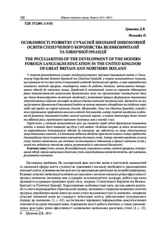 - Гриненко, Діна Віталіївна (2015) The peculiarities of the development of the modern foreign languages education in The United Kingdom of Great Britain and Northern Ireland Педагогічна освіта: теорія і практика, 1 (18). pp. 132-137. ISSN 2309-9763