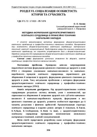 - Єжова, О. О. (2013) Method of forming promotional of health-encouraging educational surrounding in vocational educational establishments Педагогічні науки: теорія, історія, інноваційні технології, 5 (31). pp. 386-393.