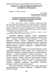 The article proposed a method of forming promotional of health-encouraging educational surrounding in vocational educational establishments. Health-encouraging educational surrounding is understood as a system of influences, conditions and requirements of the material and technical, educational and communicative components aimed at preserving and strengthening health and value attitude to health forming in all subjects of the pedagogical process.