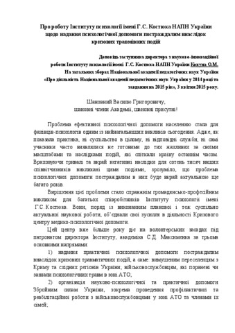 The report highlights the content of the G.S. Kostiuk Institute of psychology work's to provide psychological assistance to victims of traumatic events 2014 - 2015 years.