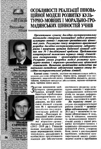Кизенко Василь. Особливості реалізації інноваційної моделі розвитку культурно-мовних і морально-громадянських цінностей учнів [Текст] / Василь Кизенко, Михайло Савченко // Директор школи, ліцею, гімназії. – 2014. – №5-6. – 176 с. – С. 56–60. |