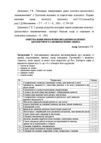 - Циганенко, Галина Валентинівна (orcid.org/0000-0003-1950-157X) (2003) Questionnaire of socio-psychological mechanisms the politico-ideological self-determination (identity) Збірник наукових праць Інституту психології ім.К.С. Костюка. – Т. V. – Ч. 5. pp. 294-298.