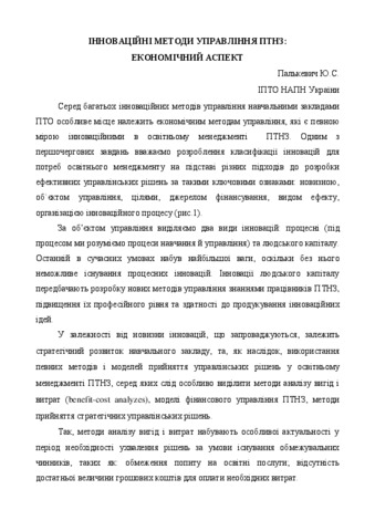 - Палькевич, Юлія Святославівна (2015) Innovative methods of management of the VTEI: the economic aspect In: Materials reporting Scientific Conference 2014 on "Scientific and methodical support of vocational education and training" , 1 (1). ІПТО НАПН України, м. Київ. (Submitted)