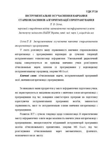 - Осіпа, Людмила Володимирівна (2015) Modernization instrumental training high school students of algorithms and programming Комп'ютер у школі та сім'ї, 1 (121). pp. 12-14. ISSN 2307-9851