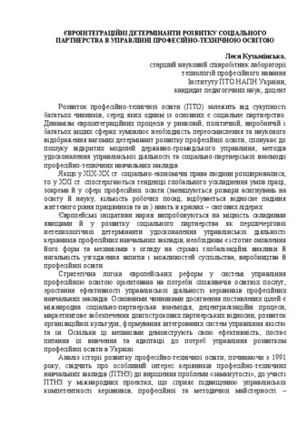 - Кузьмінська, Л.Д. (2015) Eurointegration determinants of social partnership in the management of vocational education In: Науково-методичне забезпечення професійної освіти і навчання: матеріали звітної науково-практичної конференції ІПТО . Інститут професійно-технічної освіти НАПН України, м.Київ, Україна, pp. 210-212.