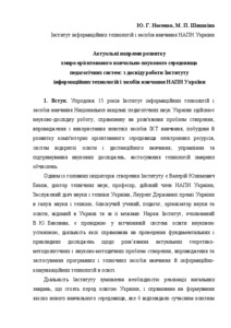 - Носенко, Ю.Г. and Шишкіна, М.П. (2015) Recent trends of development of cloud-based learning and scientific environment of pedagogical system: from the experience of the Institute of Information Technologies and Learning Tools of NAPS of Ukraine Науковий часопис НПУ імені М. П. Драгоманова. Серія 2: Комп'ютерно-орієнтовані системи навчання (20). (In Press)