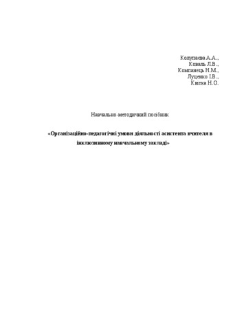 Колупаєва, А.А. (orcid.org/0000-0002-4610-5081), Коваль, Людмила Вікторівна (orcid.org/0000-0002-3342-8922), Компанець, Н.М. (orcid.org/0000-0003-1721-3662), Луценко, Інна and Квітка, Н.О. (2014) Instructor's Manual "Organizational-pedagogical conditions of assistant teachers activity in inclusive educational institution " . "Атопол", м. Київ, Україна. ISBN 978-966-2459-28-9