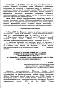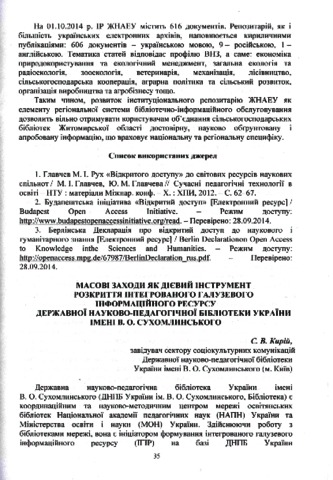 - Кирій, Світлана Василівна (2014) Mass events as an effective tool for disclosure of the integrated branch information resource of V. O. Sukhomlynskyi State Scientific and Pedagogical Library of Ukraine Бюлетень Національної наукової сільськогосподарської бібліотеки НААН, 2. pp. 35-40.