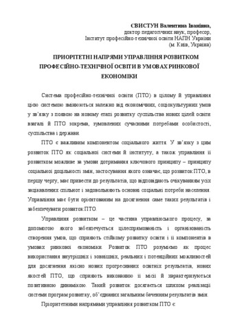 - Свистун, Валентина Іванівна (2015) The priority areas of management development of vocational education in market economy conditions In: Розвиток сучасної освіти: теоря, практика, інновації: зб. матеріалів міжнар. наук.-практ. конф . Міленіум, м.Київ, Україна, pp. 148-150.