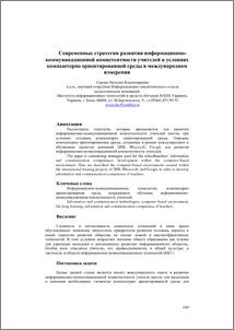 - Сороко, Н.В. (orcid.org/0000-0002-9189-6564) (2013) Сучасні стратегії розвитку інформаційно-комунікаційної компетентності вчителів в умовах комп'ютерно орієнтованого середовища у міжнародному вимірі "Образовательные технологии и общество журнал" Международного Форума, 1 (16). pp. 699-736. ISSN 1436-4522