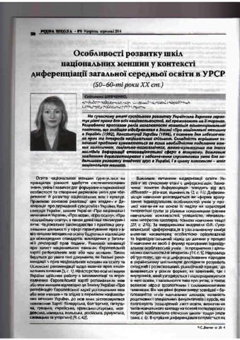 - Шевченко, Світлана Миколаївна (2014) Features of Minority Schools differentiation in the context of secondary education in the USSR (50-60 years of the twentieth century). Рідна школа, 8 (9). pp. 50-56. ISSN 0131-6788