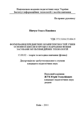 - Пінчук, О.П. (2010) Formation of subject competency of basic school students in the process of teaching physics by means of multimedia technologies Dissertation candidate thesis, Інститут інформаційних технологій і засобів навчання.
