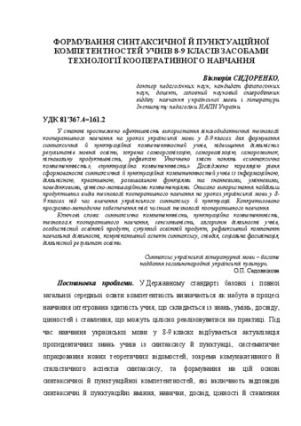 - Сидоренко, В.В. (2015) Formation of syntactic and punctuation competencies of pupils of 8-9 classes by means of cooperative learning technology Українська мова і література в школі, 2 (154). pp. 7-14.