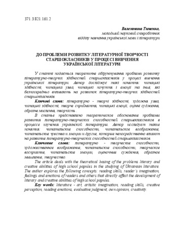 - Тименко, Валентина Миколаївна (2015) On the problem of literary works of high school students in the study of Ukrainian literature Теорія і методика навчання української літератури: актуальні проблеми, 1 (3). pp. 358-364.