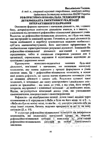 - Васьківська, Галина Олексіївна (orcid.org/0000-0002-8714-8512) (2015) Reflexively and cognitive technology as a determinant of the effective realization of interactive teaching Методичний вісник Науково-дослідницької лабораторії дидактики початкової освіти, 1. pp. 85-87.