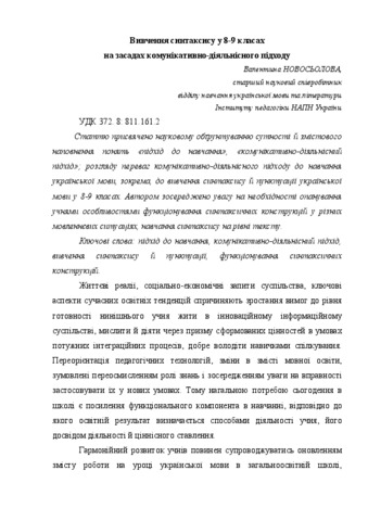- Новосьолова, Валентина Іванівна (2015) The study of syntax in 8-9 classes based on communicative and active approach Українська мова і література в школі, 2 (154).