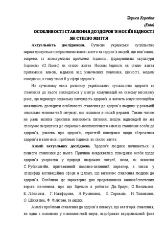 - Коробка, Лариса Миколаївна (orcid.org/0000-0001-9306-0624) (2014) Peculiarities of the attitude to health of people in poverty Науковий вісник Чернівецького національного університету. Серія: Педагогіка та психологія (686). pp. 49-58.