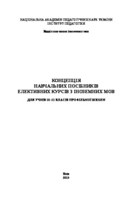 Conception reveals the basic scientific and theoretical bases of textbooks content design for foreign language elective courses for profile school students, in particular the principles and characteristics of selection of educational material and means of organization. It describes the content and Structure tutorials "Culture and Art of Great Britain','English for business communication," "Welcome to Ukraine", "Country: Spain and Latin America", "German-speaking countries", "My France "and are characterized by their mastery of core technologies. Concept is addressed to teachers of foreign languages, methodologists, authors of textbooks, students of language faculties of higher educational institutions.