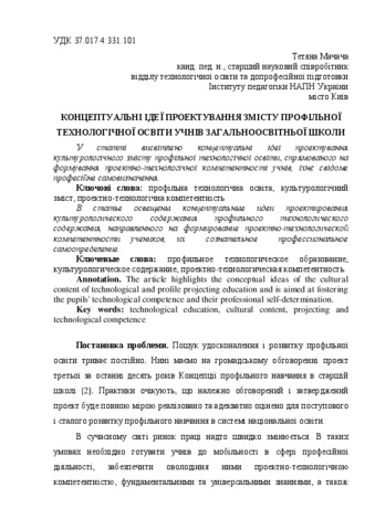 The article highlights the conceptual ideas of the cultural content of technological and profile projecting education and is aimed at fostering the pupils' technological competence and their professional self-determination.