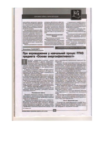 - Радкевич, В.О. (2011) On implementation of the learning process of VET subject " Fundamentals of Energy Efficiency" Професійно-технічна освіта, 1 (50). pp. 42-43.