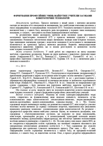 - Васьківська, Галина Олексіївна (orcid.org/0000-0002-8714-8512) (2015) Formation of professional skills for future teachers by means of computer technology Науковий вісник Чернівецького університету (735). pp. 28-33.